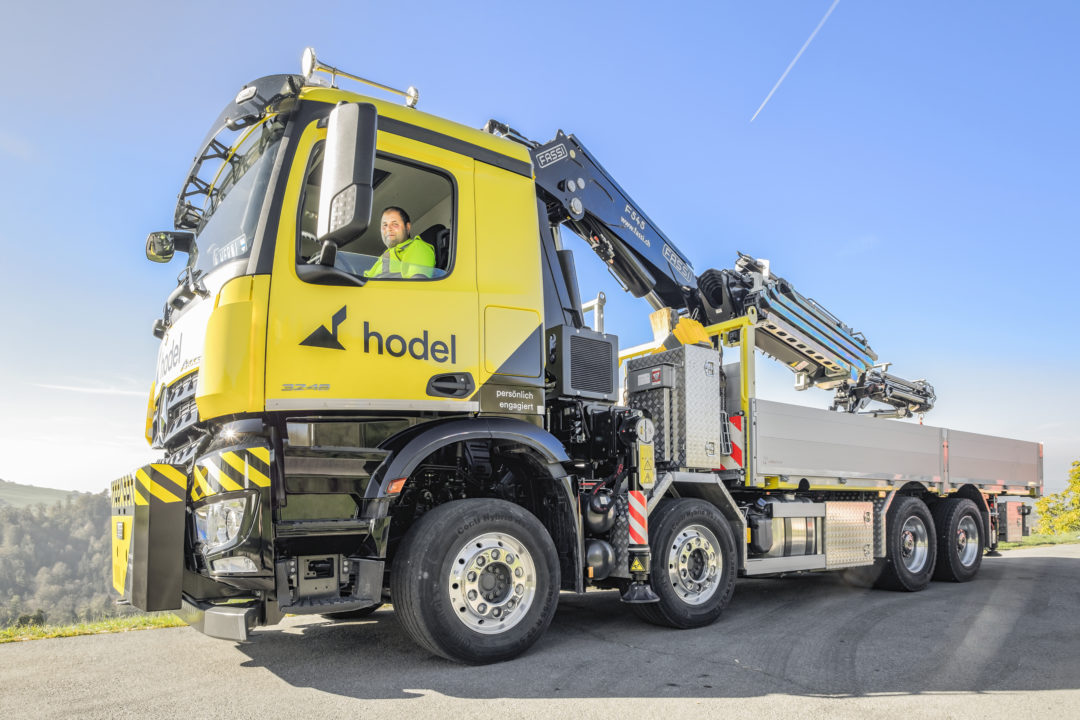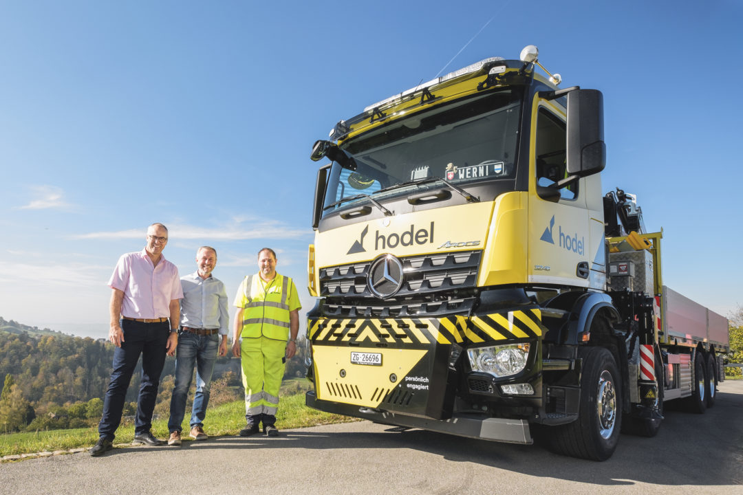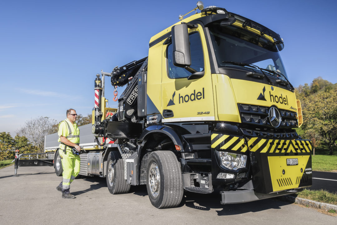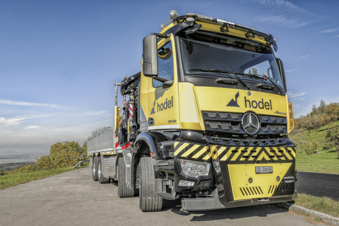 Zuwachs im Hodel-Fahrzeugpark: Ein Lastwagen des Typs Arocs von Mercedes-Benz ist neu mit Chaffeur Werni Iten für unsere Baustellen im Einsatz. Der vierachsige Truck mit Pritschenaufbau verfügt über einen Ladekran von Fassi, der dank Frontabstützung auch ein Arbeiten über die Führerkabine zulässt. Die maximale Traglast beträgt bis zu 9,5 Tonnen.
